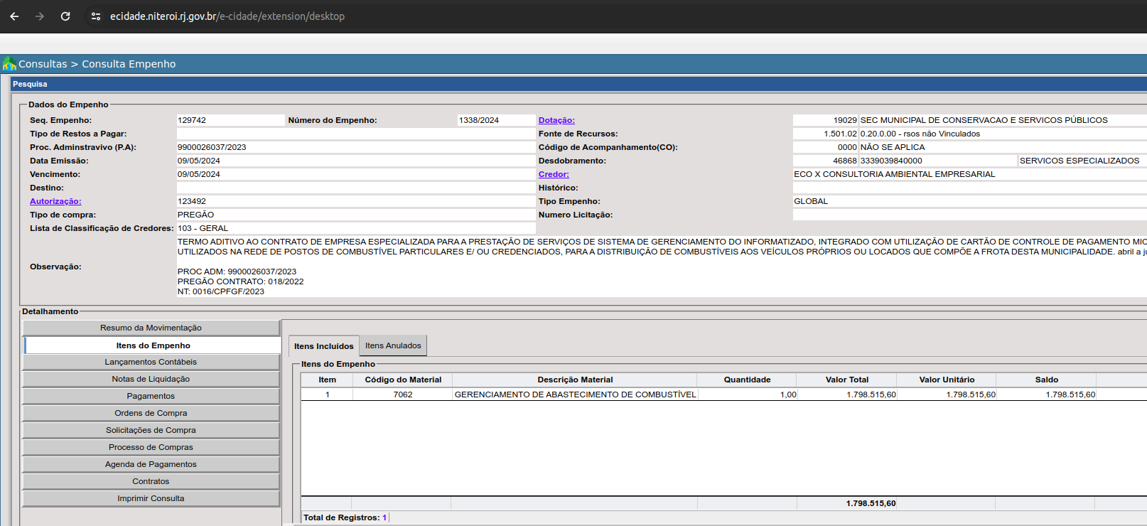 1 - MUNICIPIO DE NITEROI > DB:FINANCEIRO > Empenho > Consultas > Consulta Empenho