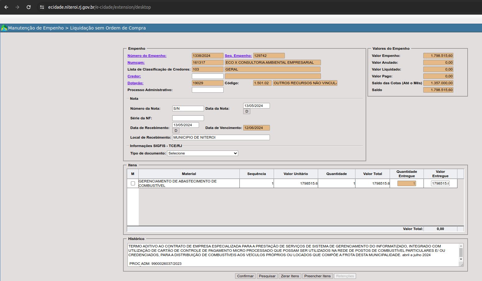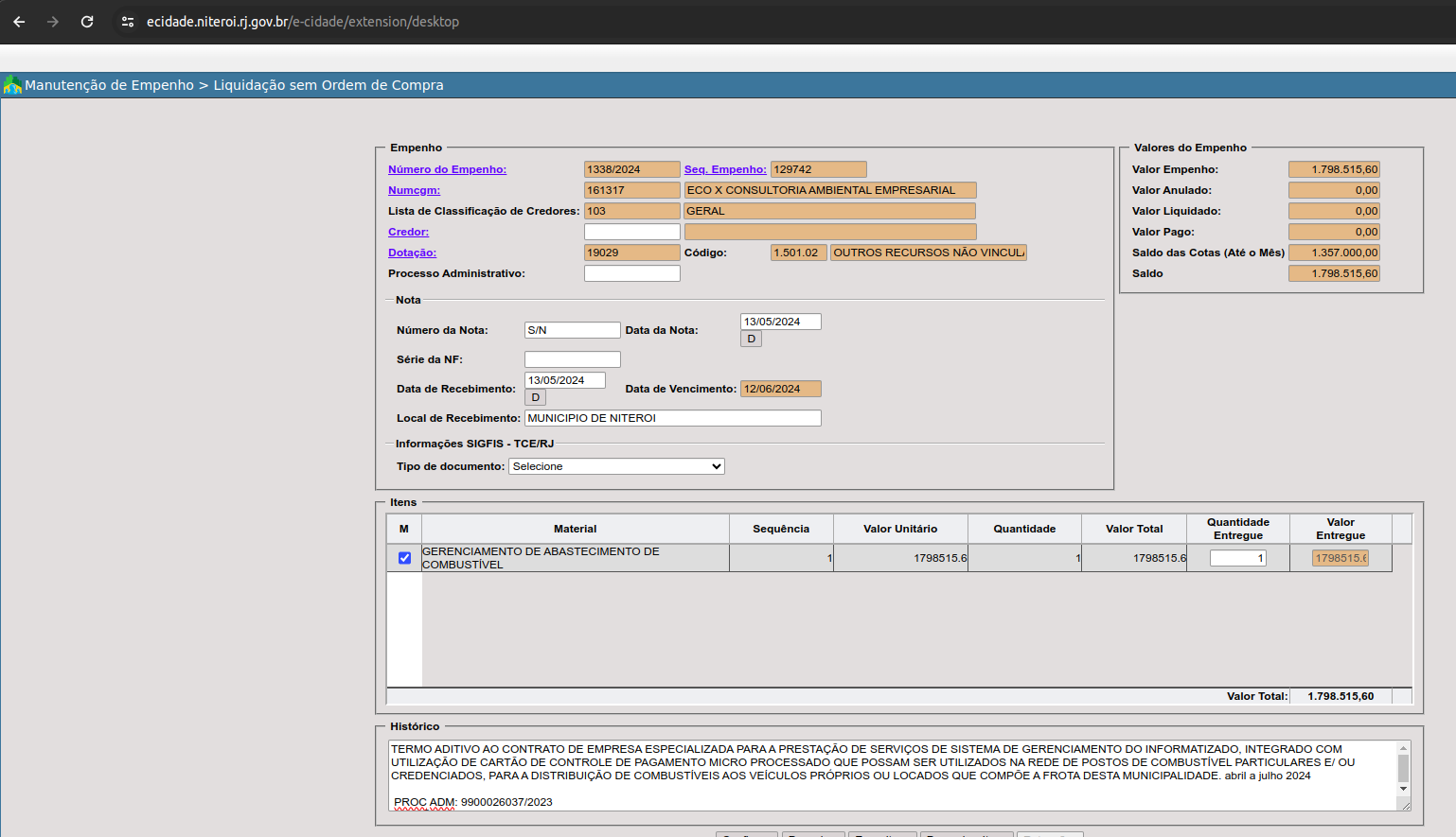 1 - MUNICIPIO DE NITEROI > DB:FINANCEIRO > Empenho > Procedimentos > Manutenção de Empenho > Liquidação sem Ordem de Compra