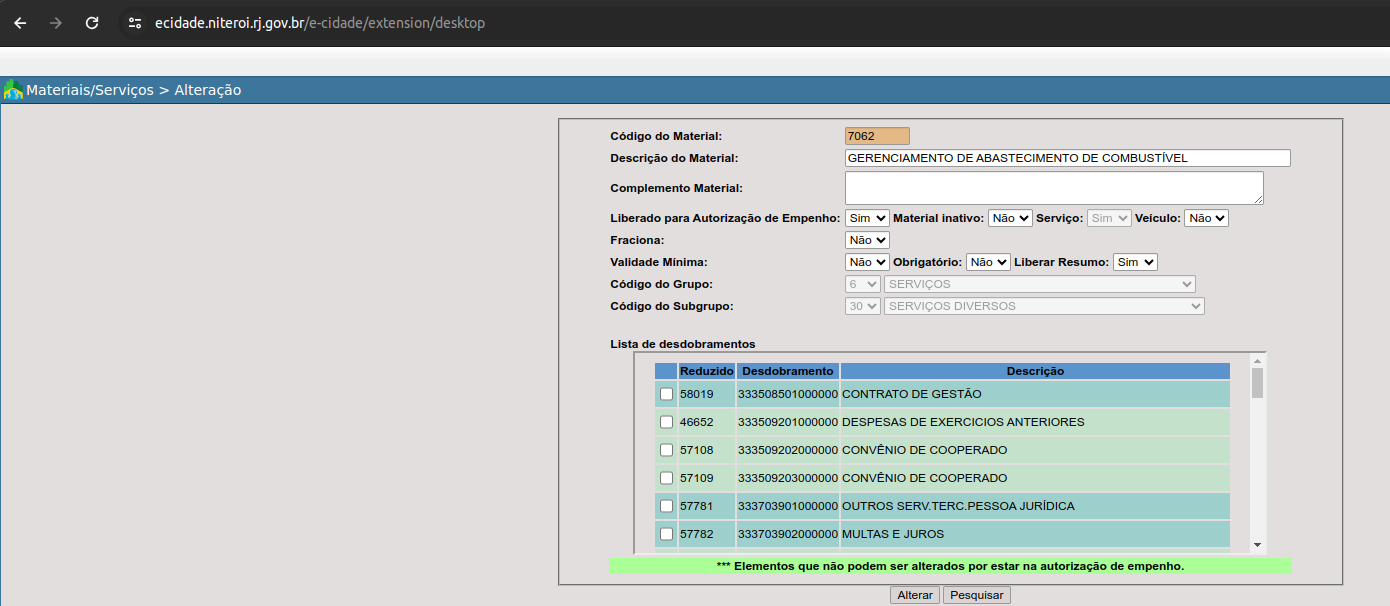 1 - MUNICIPIO DE NITEROI > DB:PATRIMONIAL > Compras > Cadastros > Materiais/Serviços > Alteração