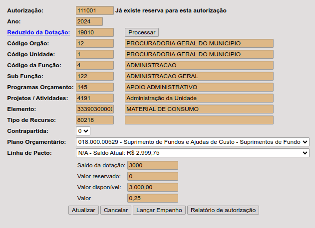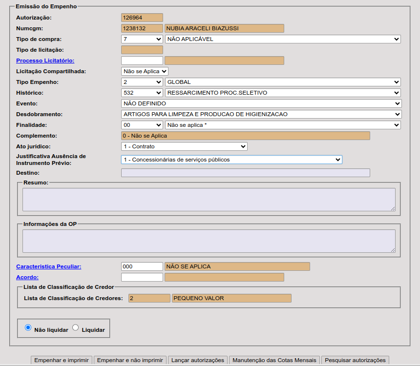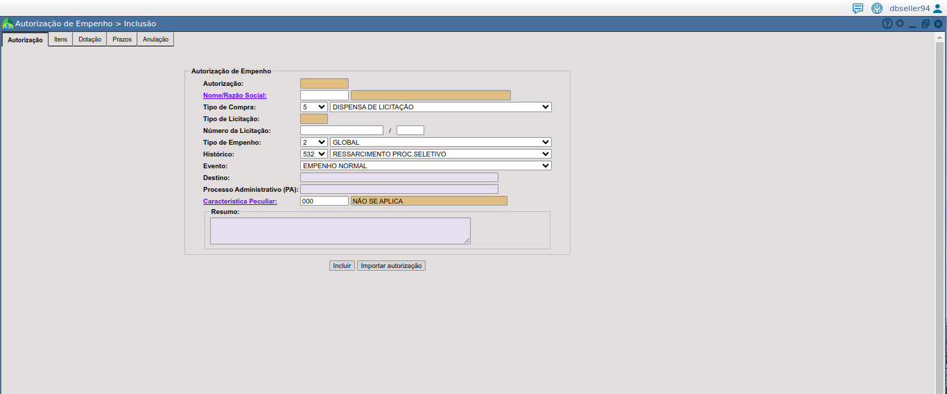 Para autorizações que não vêm dos módulos de Compras ou Licitações, todos os dados devem ser preenchidos manualmente no sistema. O caminho é: Módulo Empenho > Procedimentos > Autorização de Empenho > Inclusão.