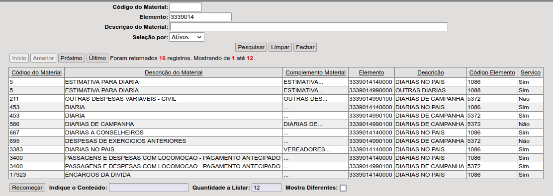 O item pode ser escolhido pelo código ou através de uma busca pelo nome do material.