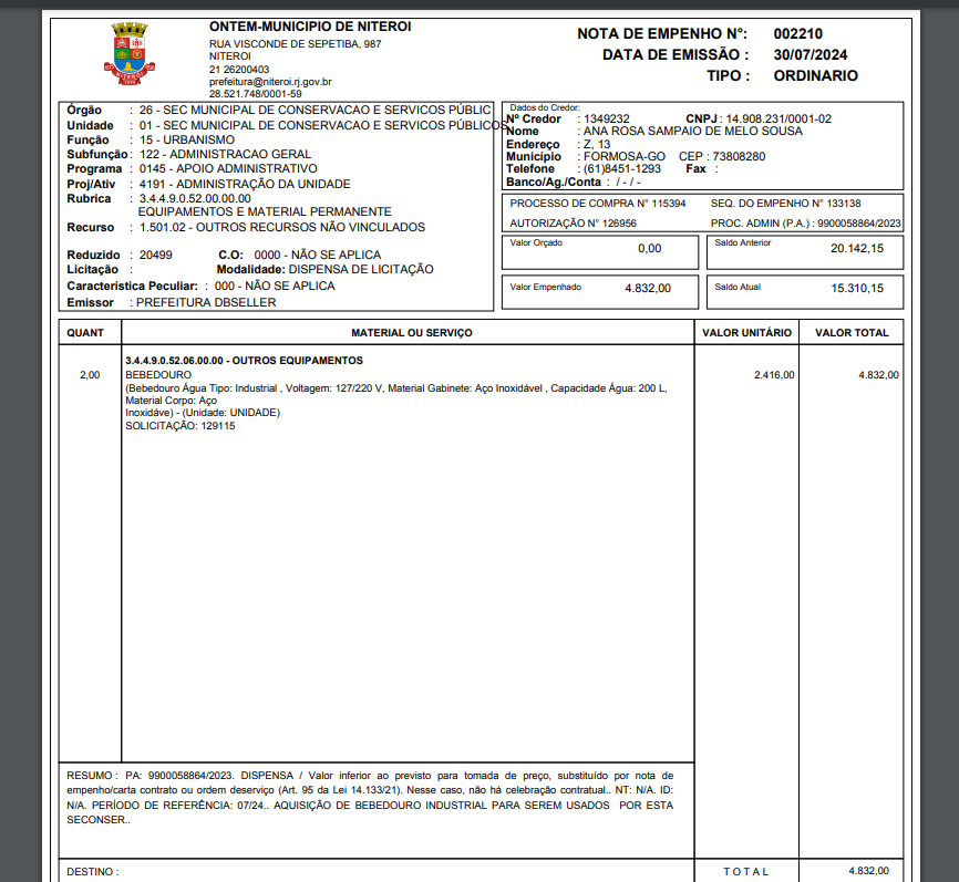 • Dotação Orçamentária: Secretaria, Unidade, Atividade, Elemento de Despesa e Desdobramento;