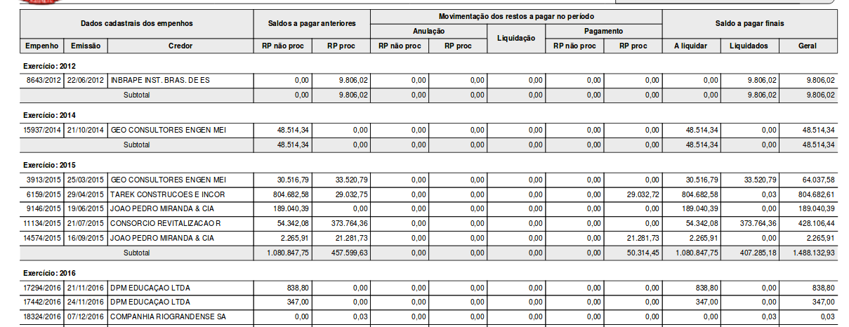 - Restos a Pagar: Exibe a execução de restos a pagar de exercícios anteriores.